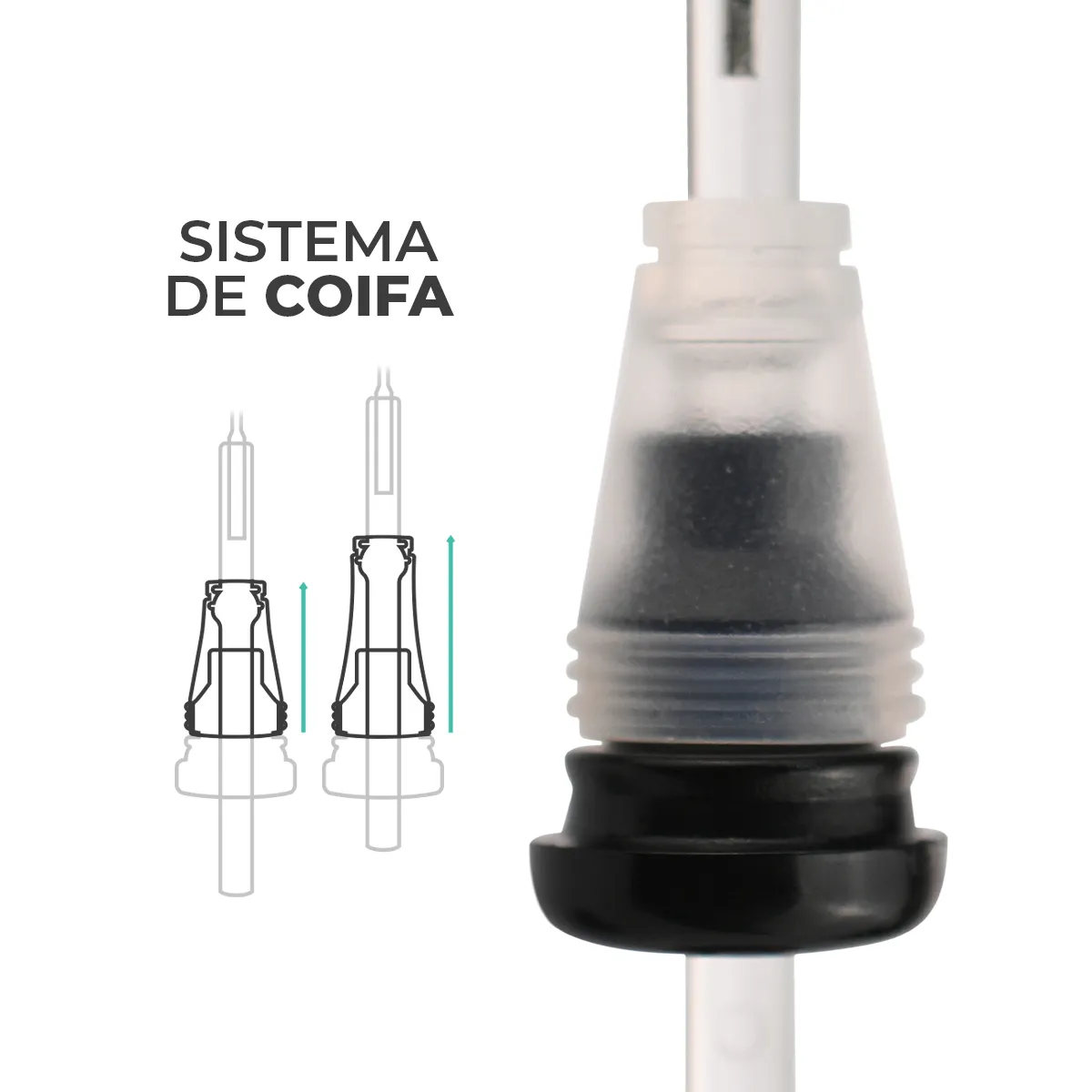 Desenvolvidos com um sistema de segurança, seu mecanismo de retorno da agulha possui uma membrana de silicone em vez de molas. Isso evita que tinta, sangue ou outros fluidos corporais retornem ao seu equipamento, protegendo tanto sua máquina quanto seu cliente. Além disso, uma vedação durável evita que o cartucho se solte, reduz a folga entre a agulha e a ponta e resulta em maior precisão e perfuração mais suave.